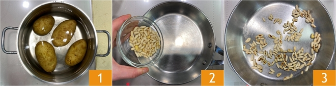 Para preparar a salada de batata com chicória e feta, primeiro cozinhe as batatas começando com água fria por cerca de 30-40 minutos, até que fiquem macias o suficiente para perfurar com um garfo 1. Enquanto isso, coloque os pinhões em uma frigideira 2 e toste-os por alguns minutos 3, depois reserve.
