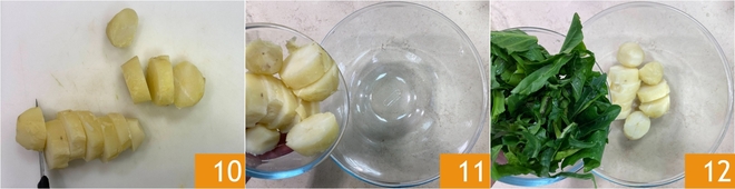Quando as batatas estiverem frias, retire a casca e corte-as em cubos de aproximadamente 3-4 cm 10. Transfira os cubos de batata para uma tigela grande 11, depois adicione a chicória que você escorreu e secou 12.