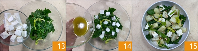 Adicione também o feta 13 e os pinhões tostados. Finalmente, tempere com o molho 14. Misture delicadamente e sirva sua salada de batata com chicória e feta 15!