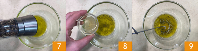 Coloque o óleo em uma tigelinha, depois adicione o sal, a pimenta 7 e o vinagre de maçã 8. Emulsione bem e reserve 9.