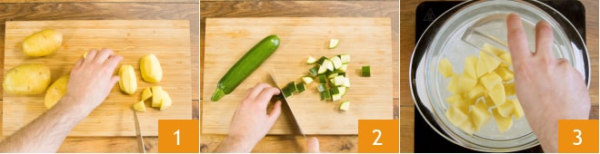 Para preparar a salada de batata e abobrinha, comece pelos vegetais. Descasque as batatas e corte em pedaços de cerca de dois centímetros 1, corte as pontas e corte as abobrinhas no mesmo tamanho 2. Em uma panela a vapor, cozinhe as batatas por cerca de dez minutos 3