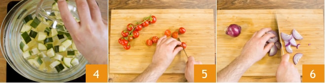 e as abobrinhas 4. Uma vez cozidas, deixe esfriar um pouco. Enquanto isso, lave os tomatinhos e corte-os ao meio 5, finalize descascando e fatiando a cebola roxa 6.