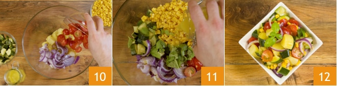 cebolas e tomatinhos 10, abobrinhas e milho. Ajuste o sal e tempere com um fio de óleo, pique algumas folhas de manjericão e misture delicadamente. Por fim, adicione a emulsão de mostarda e óleo e misture novamente delicadamente 11. Sua salada de batata e abobrinha está pronta, decore com um pouco de manjericão e bom apetite 12.