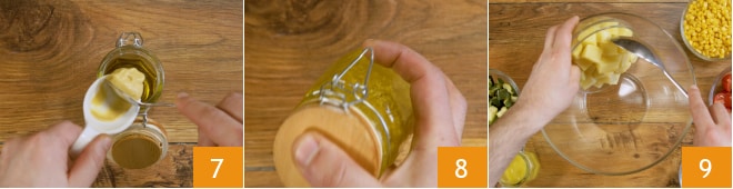 Prepare o molho colocando em um potinho o óleo e a mostarda 7, adicione sal e pimenta, feche o pote e agite por alguns instantes para emulsionar tudo 8. Neste ponto, você está pronto para montar a salada. Junte as batatas 9,