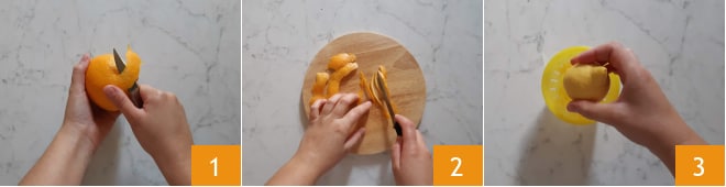 Para preparar a salada de caqui, rúcula e funcho, comece cortando a casca de meia laranja, tomando cuidado para não pegar a parte branca 1. Corte a casca em tiras finas 2 e reserve até o momento de usá-las. Esprema meia laranja e meio limão 3,