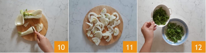 Pegue um funcho também já lavado e corte-o em fatias 10 11. Em uma saladeira, coloque a rúcula já lavada 12,