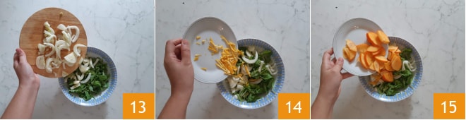 adicione o funcho 13, a casca de laranja cortada em tiras 14 e o caqui maçã em fatias 15.