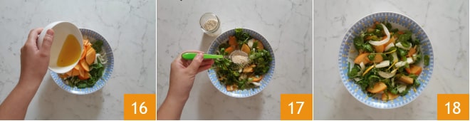 Despeje por cima a vinagrete de laranja e limão 16, misture tudo e adicione uma colher de sopa de sementes de gergelim 17. Sirva imediatamente a salada de caqui, rúcula e funcho 18.