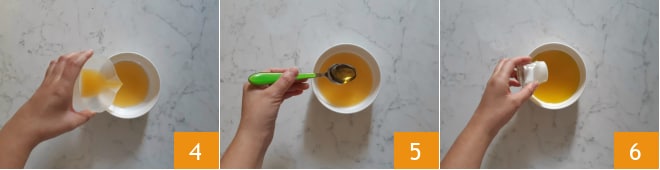 recolha o suco em uma tigela 4. Adicione uma colher de sopa de mel 5, uma pitada de sal 6 e uma pitada de pimenta preta moída.