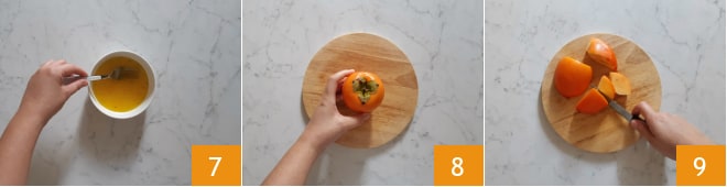 Com um garfo, bata tudo para misturar bem os ingredientes 7. Pegue um caqui maçã já lavado e seco 8, corte-o em fatias finas 9.