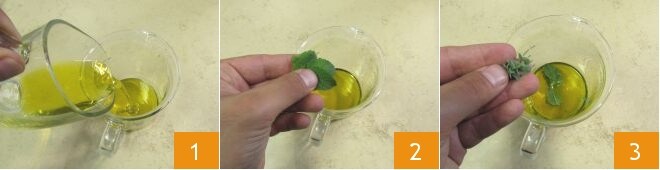Para preparar a salada de carne bovina temperada e Grana Padano, primeiro prepare a marinada para a carne: despeje o azeite de oliva em um copo alto e estreito 1, adicione as folhas de hortelã 2, o tomilho 3,
