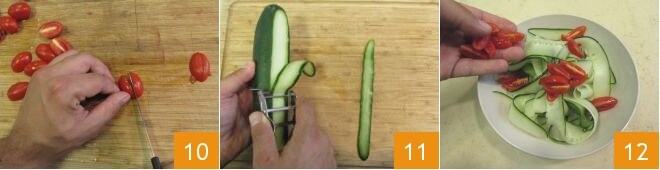 Enquanto isso, dedique-se ao restante do prato: lave e depois divida os tomatinhos em 4 partes 10, descasque o pepino e corte-o em fatias finas com a ajuda de um descascador 11. Coloque os pepinos em uma tigela e adicione os tomatinhos cortados 12.