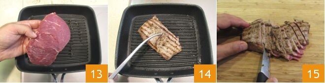 Agora você pode cozinhar a carne: após o tempo de marinada, cozinhe o filé em uma grelha bem quente por cerca de 3-4 minutos de cada lado (13-14). Transfira o filé para uma tábua de corte, deixe-o descansar por alguns segundos e corte-o transversalmente em fatias finas 15.