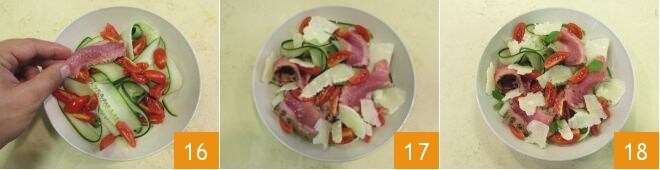 Agora você pode completar a salada: coloque as fatias de carne sobre os pepinos e tomates 16, adicione as lascas de Grana Padano DOP 17, tempere com um fio de azeite, sal e pimenta e, por fim, decore com algumas folhinhas de hortelã fresca. Sua salada de carne bovina temperada e Grana Padano está pronta para ser saboreada 18!