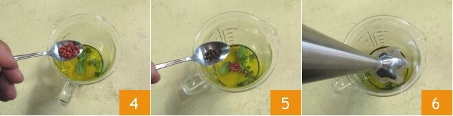 o pimenta rosa 4 e a pimenta preta 5 e bata com um mixer de imersão 6 até obter uma consistência homogênea.