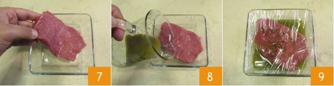 Limpe o filé de carne bovina removendo eventuais partes de gordura ou tecido conjuntivo, depois transfira para um recipiente 7 e despeje a emulsão de óleo e ervas aromáticas dentro 8. Cubra com filme plástico e deixe marinar em temperatura ambiente por cerca de 15 minutos 9. Você pode virar a carne após 6-7 minutos para mergulhar bem o outro lado da carne na marinada.
