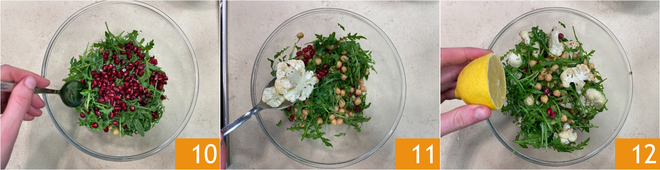 Misture 10 e adicione a couve-flor fria 11, depois esprema o suco de limão sobre a salada 12