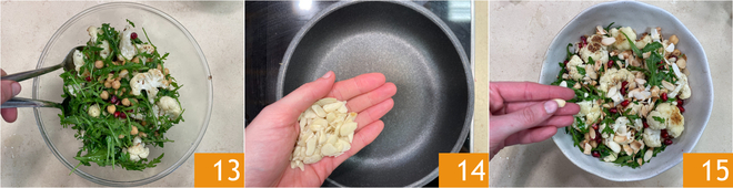 Adicione os outros 20 gramas de óleo e misture 13. Torre brevemente as lâminas de amêndoa em uma frigideira quente, mexendo continuamente para não queimar 14. Enfeite a superfície e sua salada de couve-flor assada está pronta 15.
