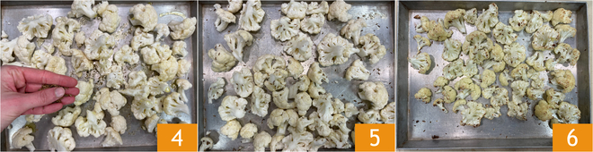Adicione também o cominho 4 e sua couve-flor está pronta 5 para assar em forno estático, pré-aquecido a 200°, por cerca de 30 minutos; deixe esfriar quando estiver pronta 6.