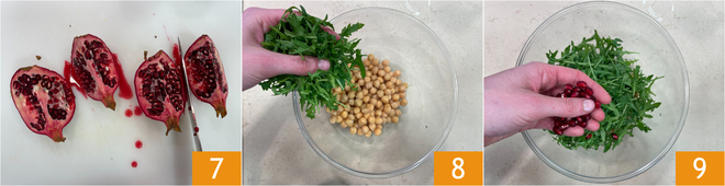 Enquanto isso, retire os grãos da romã e separe 100 g de sementes 7. Lave os grãos-de-bico e coloque-os em uma tigela grande junto com a rúcula, também lavada e seca 8. Adicione as sementes de romã 9.