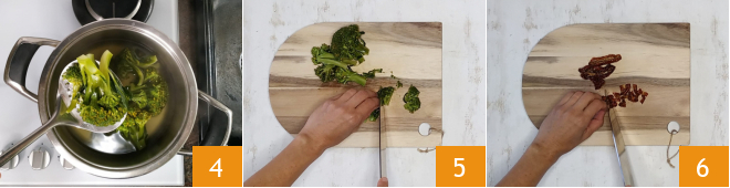 Uma vez cozidos os brócolis, você pode escorrê-los 4. Coloque-os em uma tábua e corte-os em pedaços pequenos 5. Escorra o óleo dos tomates secos e corte-os também em pedaços pequenos 6.