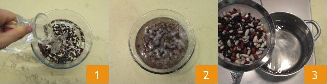 Para preparar a salada de feijões mistos e abóbora, comece pelos legumes. O mix de feijões secos (cannellini, borlotti e de corda) deve ser colocado para reidratar em água 1 para que cozinhem rapidamente. Deixe-os reidratar por 24 horas 2: é recomendável que, após as primeiras 12 horas, você troque a água para eliminar as impurezas que aparecerão na superfície. Após o tempo, enxágue os feijões e coloque-os em uma panela com bastante água fria 3,