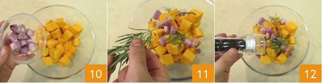 Junte-os à abóbora em uma tigela 10, aromatize com agulhas de alecrim 11. Sal e pimenta a gosto 12.