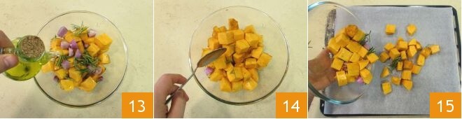Tempere também com um fio de azeite 13 e misture tudo 14. Distribua a abóbora em uma assadeira forrada com papel manteiga 15.