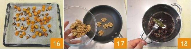 Asse em forno estático pré-aquecido a 220° por cerca de 30 minutos. Quando estiver pronto, retire do forno a abóbora e a chalota e deixe esfriar completamente 16. Torre brevemente as nozes em uma frigideira 17 em fogo moderado. Depois deixe amornar. Enquanto isso, os feijões estarão cozidos; retire a folha de louro 18