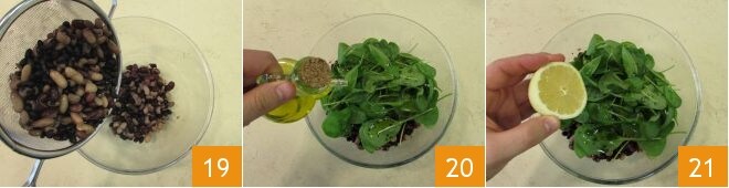 e escorra os legumes 19. Deixe-os esfriar completamente. Uma vez frios, você pode adicionar o espinafre fresco (previamente lavado e seco), temperar com azeite 20, suco de limão 21, sal e pimenta a gosto. Misture tudo