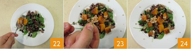 antes de servir: coloque em um prato de servir o mix de legumes e espinafre, e abóbora 22, complete com as nozes e folhas de tomilho fresco 23. Sua salada de feijões mistos e abóbora está pronta para ser saboreada 24!