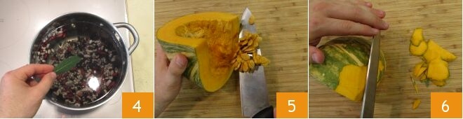 acrescente também uma folha de louro e leve ao fogo 4. Deixe ferver e depois cozinhe em fogo brando por algumas horas, verificando de tempos em tempos o cozimento para garantir que estejam na consistência desejada. O importante é que os feijões, uma vez cozidos, ainda estejam um pouco crocantes, perfeitos para serem misturados na salada. Enquanto os feijões cozinham, você pode se dedicar à abóbora: retire as sementes internas 5 e corte a casca 6.