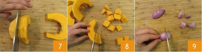 Divida a polpa primeiro em fatias grossas 7 depois em cubos de cerca de 2 cm 8 Você deve obter cerca de 600 g de polpa. Descasque a chalota e corte-a em fatias não muito finas 9.