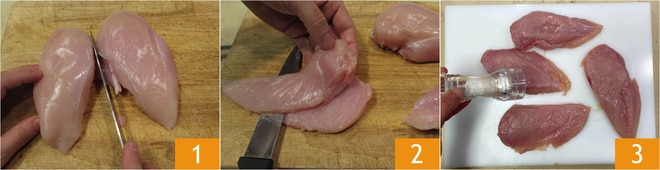 Para preparar a salada de frango e abacate, primeiro divida o peito de frango inteiro em 2 partes 1, depois corte cada uma ao meio no sentido horizontal para obter 4 fatias 2. Salpique sal e pimenta nas fatias de ambos os lados 3.