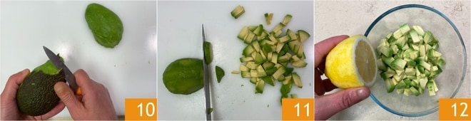 Descasque a polpa 10 e corte-a em cubos 11. Transfira o abacate para uma tigela e borrife algumas gotas de suco de limão para evitar que escureça 12.