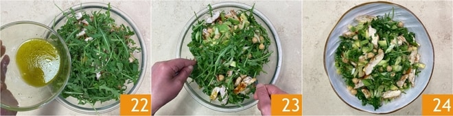 Adicione também a rúcula lavada e seca 19 e o frango 20, depois perfume com a casca ralada de limão 21.