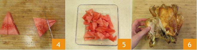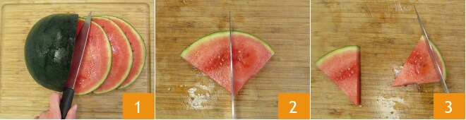 Para preparar a salada de frango e melancia, comece com a melancia. Após cortá-la em fatias de 2 cm 1, faça gomos 2 e retire a casca 3.