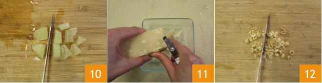 Então, corte a polpa em pedaços 10. Faça lascas do pedaço de queijo usando um descascador de batatas ou uma faca. Depois, pique grosseiramente as avelãs 12.