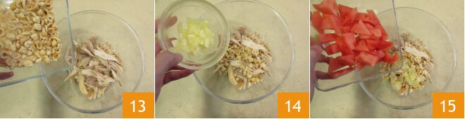 Agora passe à composição. Em uma tigela, coloque o frango desfiado, as avelãs 13, o limão 14 e a melancia 15.