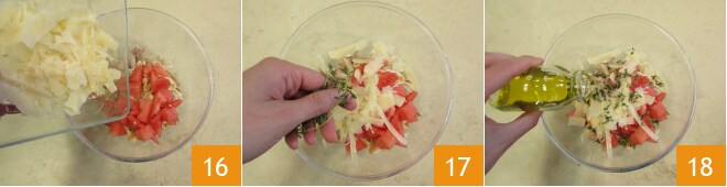 As lascas de queijo 16, o tomilho desfolhado 17 e o óleo 18.