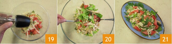 Por fim, ajuste o sal e a pimenta 19, misture 20 e sua salada de frango e melancia estará pronta para ser servida 21.