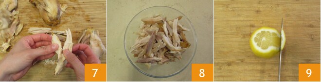 Deles, obtenha tiras não muito finas 7, conforme vai fazendo, coloque em uma tigela 8. Por fim, cuide do acompanhamento. Descasque o limão: basta remover a casca com uma faca para eliminar também a parte branca 9.