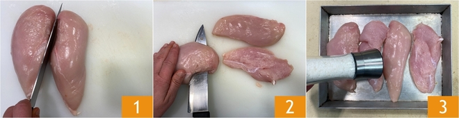 Para preparar a salada de frango light, divida o peito em dois 1, então obtenha duas fatias de cada um 2. Coloque os filés em uma assadeira, sal e pimenta 3.