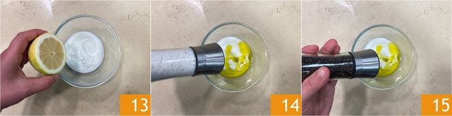 Prepare o molho de iogurte: em uma tigela coloque o iogurte natural e acrescente o suco de limão 13, um fio de azeite, uma pitada de sal 14 e uma pitada de pimenta 15.