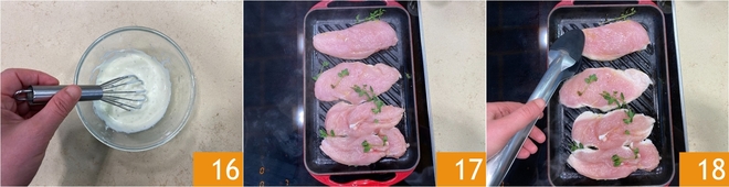 Misture vigorosamente com um batedor até obter um creme liso e aveludado 16. Agora pegue o frango: aqueça bem a grelha e coloque os filés marinados por cima 17. Cozinhe em fogo alto por cerca de cinco minutos de cada lado, virando com uma pinça 18.