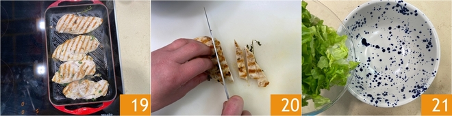 Quando estiverem bem dourados e com as típicas marcas da grelha 19, abaixe ligeiramente o fogo e continue cozinhando por mais dez minutos, virando de vez em quando. Uma vez cozidos, deixe esfriar um pouco e corte em tiras regulares 20. Neste ponto, você pode montar sua salada: coloque no fundo de uma tigela grande a alface 21.