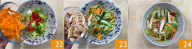 Adicione os tomatinhos e as cenouras 22, depois coloque também o pepino. Finalmente, complete com o frango grelhado cortado em tiras 23. Sua salada de frango light está pronta para ser servida 24, tempere a gosto com o molho de iogurte.