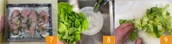 Cubra a assadeira com filme plástico 7 e deixe marinar na geladeira pelo tempo necessário para preparar os legumes. Enquanto isso, lave bem a alface em água corrente 8 e deixe escorrer bem, depois corte grosseiramente com uma faca 9.