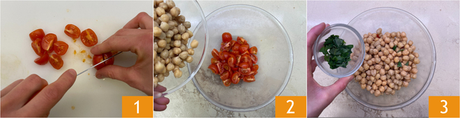 Para preparar a salada de grão-de-bico e atum, primeiro lave os tomatinhos, corte-os em quatro partes 1 e transfira para uma tigela. Adicione o grão-de-bico cozido 2, previamente lavado e bem escorrido, e o manjericão em pedaços 3.