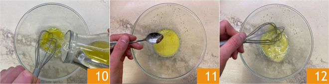 Despeje o azeite em fio e simultaneamente misture com um batedor de arames 10, como alternativa, você pode usar também um mixer de mão. Quando o molho estiver emulsionado, adicione a mostarda 11 e misture novamente 12.